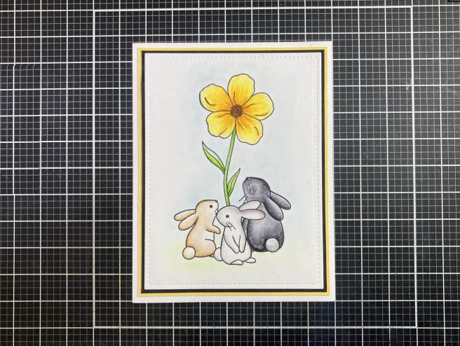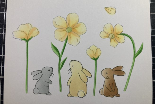I stamped the front bunny using VersaFine Onyx Black ink on Bristol Smooth card stock and stamped a second one onto masking paper and fussy-cut that out. Then it was a simple matter of masking off the front bunny and then stamping the flower and the other two bunnies on top – again using VersaFine Onyx Black ink.