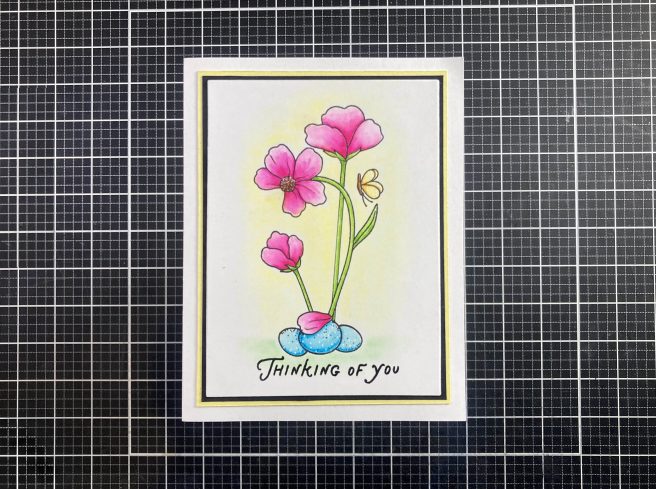 I die-cut the colored panel to 3.5″ x 4.75″ with a HA Rectangle Infinity Die, and added thin mats of Black and Pale Yellow before gluing them all down to an A2 White card base. I highlighted the eggs with some white dots using a White Gel pen for a little bit of added texture. I do love coloring with my Zig markers, and I really like the flowers on this card.