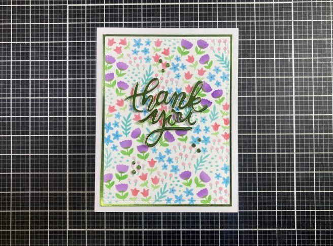 I thought the background was a little busy for any die-cut flowers or stamps from the Hero set, but figured that nice big sentiment would work. The “thank you” is an old Darice Sentiments for Card Making die set that has been in my stash for many years… this may be the first time I’m actually using it! I die-cut the sentiment from more of the Metallic Green Kraft card stock and added three die-cut blanks behind the Green for a nice chunky sentiment, and glued those to the card front. I did grab the little dots die from the Springtime Blooms Die set and die-cut all 9 of them from the same card stock and added them to the card front for a little extra bling that just happens to match perfectly!