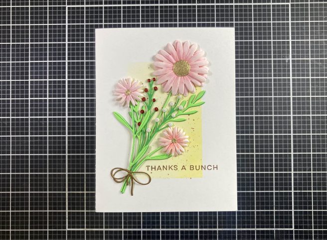 I trimmed the background to 3.75″ x 5″ and stamped the sentiment using Hickory Smoke Distress Oxide ink and embossed that with Clear Embossing powder. I added a Dark Grey mat to the background and glued those to an A2 White card base. I added the die cuts using thin foam tape and glue – the right bloom and the bottom of the stems are glued flat and everything else is attached with foam tape. The smell of these flowers reminds me of you!!