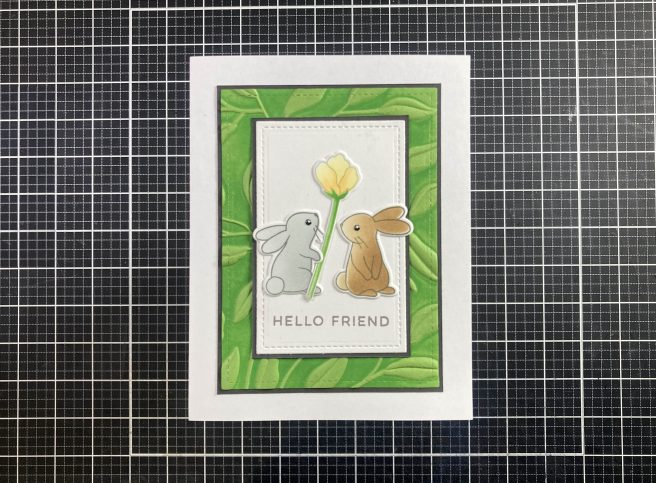 The smallest bloom and the two small bunnies make up this fun vignette. I die-cut some White card stock to 2.25″ x 3.5″ with a LFSRdie and stamped the sentiment towards the bottom with Hickory Smoke Distress Oxide ink and embossed it with Clear Embossing powder. I added a thin Dark Grey mat behind. I die-cut a plain piece of Green card stock to 3.25″ x 4.5″ and embossed that with the Spellbinders Leafy 3D Embossing folder using HA Green Apple Reactive ink on the negative side to add a bit of a darker background to the embossed leaves.