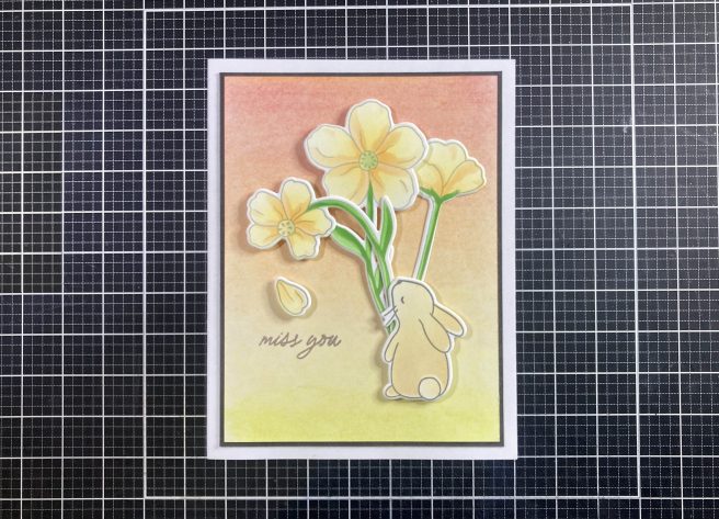 You could also stamp the images and then use the stencils to color them individually. You would just have to take some extra care with the layering. I used Hero Hues Lemon Drop and Creamsicle Reactive inks for the blooms, HA Green Apple Reactive ink and C&9th Parsley ink for the stems, C&9th Dove ink for the left bunny, Antique Linen and Vintage Photo Distress Oxide inks for the center bunny and Walnut Stain Distress Oxide ink for the bunny on the right. Ultimately, I decided to forego the stencil arrangement and just die-cut everything out!