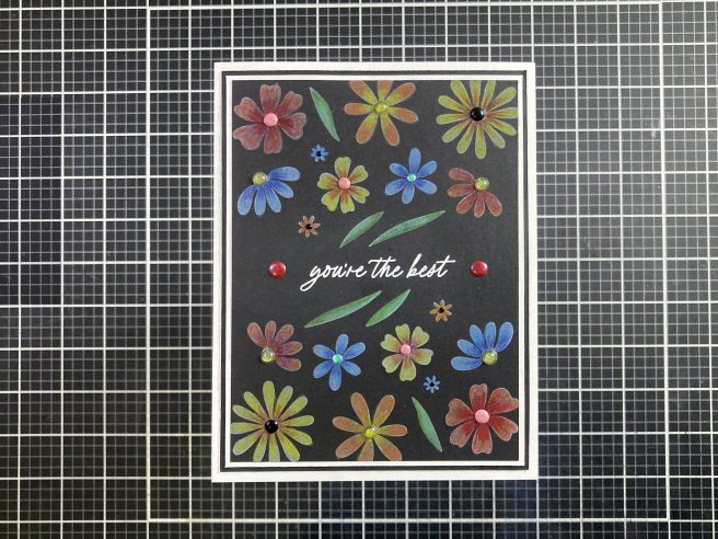 I trimmed the stamped and colored panel to 3.75″ x 5″ and added a thin White mat and a thin Black mat before gluing them all to a White card base. I stamped the sentiment with Hero Arts Unicorn White ink and embossed it with White Embossing powder. I do have a clipboard covered with a non-stick craft mat that has lots of different colors (and brands) of Enamel dots already dried and standing by. I chose a bunch of different colors and used them for the centers of all the blooms. Those add a great dimension to an otherwise flat card! And a couple of Maroon Enamel dots finishes up the sentiment and pulls the whole card together.