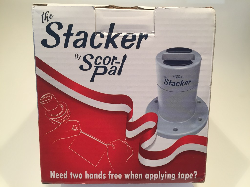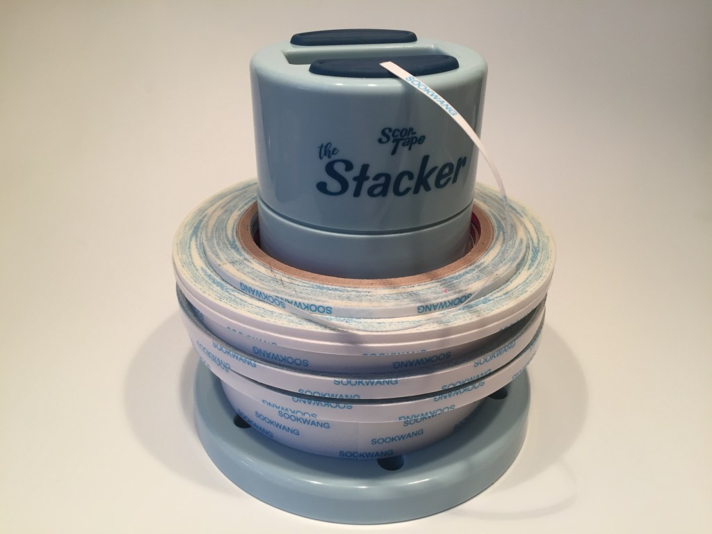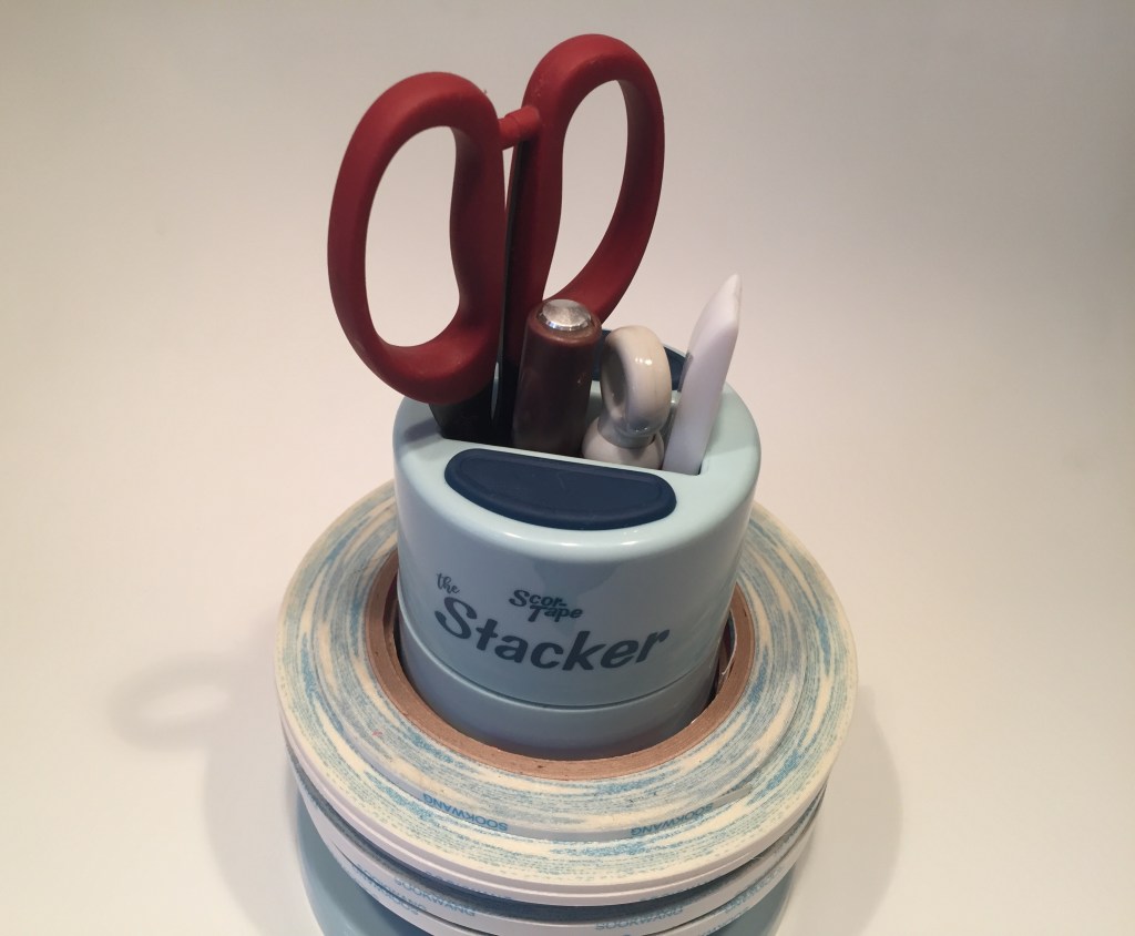 I grabbed all the different widths of Scor-Tape rolls in my stash and added them to my weighted Stacker. I was actually able to add a 2.5″ roll, a 1″ roll, a 1/4″ roll and a 1/8″ roll on The Stacker while still having a little room to spare!