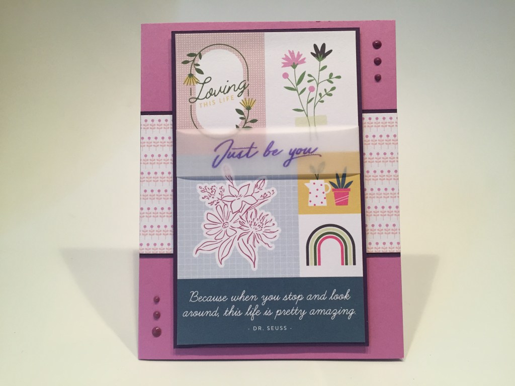 I took a 2.25″ wide piece of the tiny flower stripes pattern paper, added a thin dark purple mat behind that, and glued that down just above the center of the Lilac card base. I attached the front panel using foam tape and added some Nuvo Plum Pudding Crystal Drops (from the LFL December 2018 kit) for a final touch. I think the dark purple additions work really well with that Lilac card stock and helps keep this from being too pink..! LOVE that Dr. Seuss quote which compliments the sentiment perfectly!