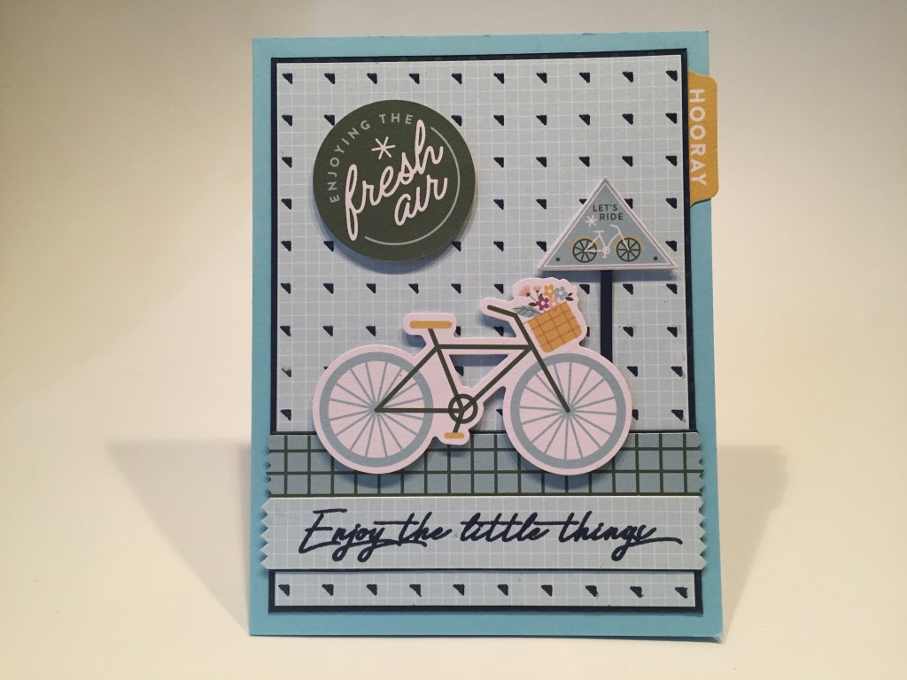 I cut another piece of the blue grid pattern paper to match the gridded banner from the ephemera pack, stamped the sentiment on that with VersaMark ink and embossed that with the Warm Navy embossing powder. I glued those two banners together and added a super thin mat of the dark blue to the top and bottom before glueing those to the card front. I added a little signpost to the ‘Let’s Ride’ ephemera piece using the same dark blue card stock, and mounted the bike, the ‘sign’ and the circle ephemera pieces with foam tape. Lastly I added the Hooray file tab under the background piece on the right side of our card. It stuck out a bit on the side, but not enough to hinder going in an envelope. I really like this card and trust me, fresh air is one of the little things I truly have left to enjoy these days!