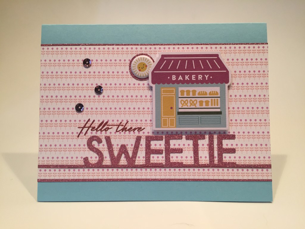 I cut more of the flower stripes pattern paper to 5.5″ x 3.25″ and glued that down to the Pale Blue card base. I cut thin strips of that glitter paper and glued them along the top and bottom edges of the pattern paper. I glued my die-cut “SWEETIE” to the pattern paper and stamped the sentiment using Aged Mahogany Distress Oxide ink and embossed that with clear embossing powder – another great match! I added the bakery ephemera piece with foam tape, cut a little glitter mat for the puffy sun sticker, and glued those peeking out from behind the building. A few pink sequins from our sequin mix and we have a fun, glittery card that completes the “hello there” sentiment perfectly!! This one’s for LIZI!!