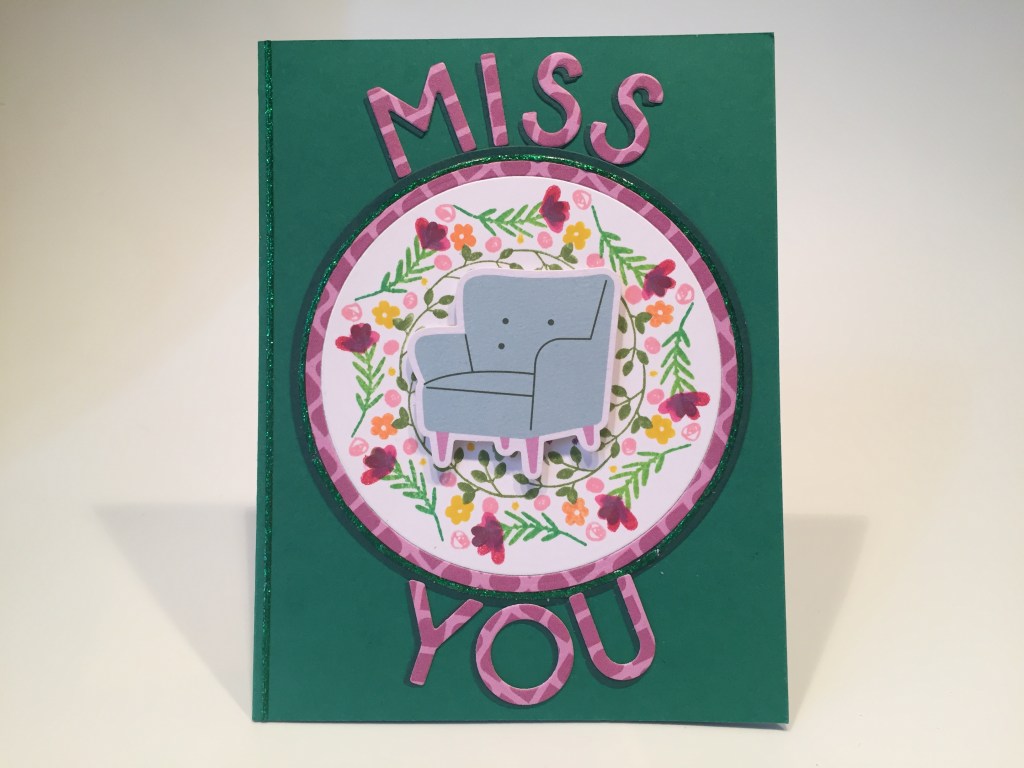 It seems I can’t get through most of my card kits these days with out a Miss You card…!! Oh so true!! This “wreath” started with the heart branch and grew from there… I used my Ombre stamp pad, and I did stamp the two smaller hearts on top of the heart branch to create more of a flower feel, and thought that worked pretty well, but, as is often the case, I couldn’t stop myself and soon filled this whole wreath all they way to the center. I do use my homemade wreath builder template, but I have to admit, it doesn’t give us much of a wreath when the whole circle is filled in, so I grabbed the empty chair ephemera piece to be the center of our stamping.