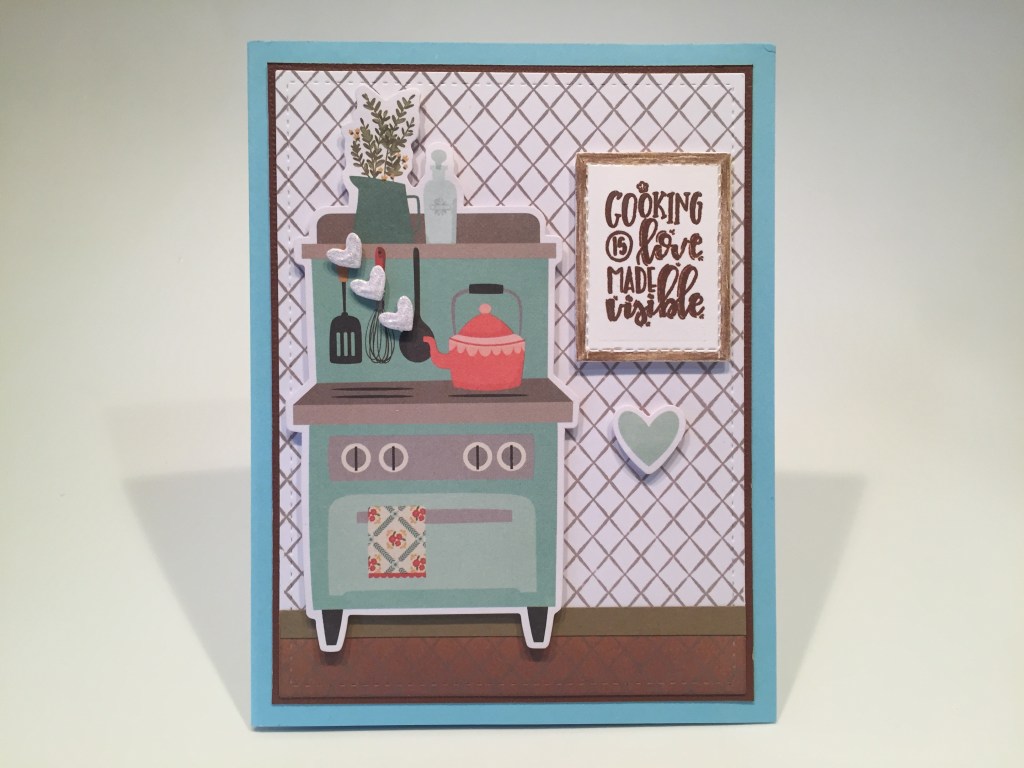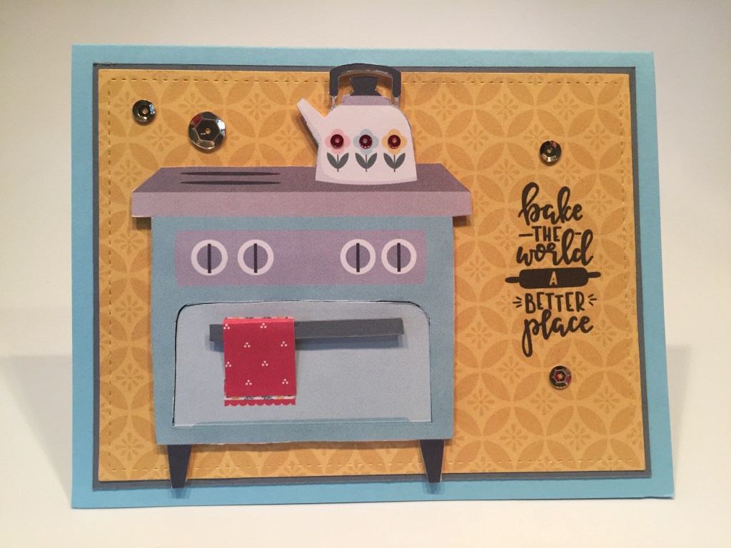 Background pattern paper cut with a LFSRD, glued to a dark grey mat and down to a Pale Blue card base. Sentiment stamped with VersaFine Onyx Black ink. I fussy-cut the stove from the large side of the pattern papers (I just eliminated the upper portion so it would fit on a card). The tea pot was a little extra fussy…! There is more here than meets the eye. The handle and towel on the oven appears dimensional… can you open it?