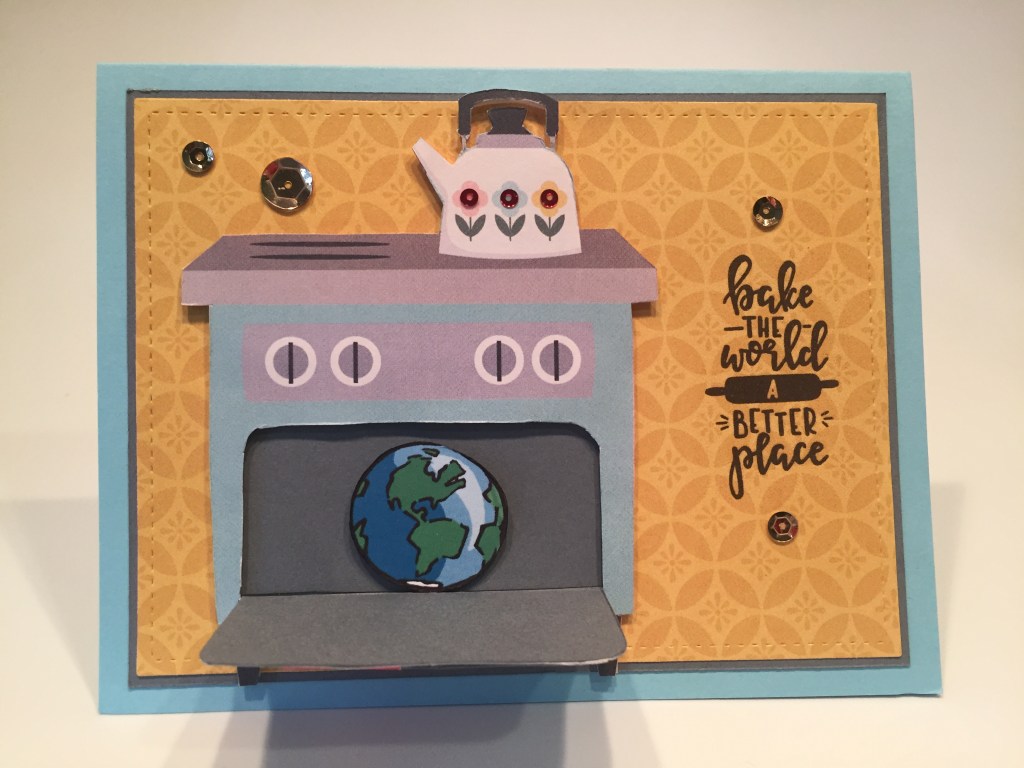 Surprise! This is a little globe image from my files, printed, fussy-cut and mounted with some foam tape. I fussy-cut the oven door and added some grey card stock to the back which continues to the back of the oven and is glued flat to the card front. The oven is mounted with foam tape and some sequins (on the tea pot too!) add sparkle and shine! I’m not sure if this is some kind of double-entendre about global warming or just a playful image to go along with this pun-y sentiment! Fun interactive card!