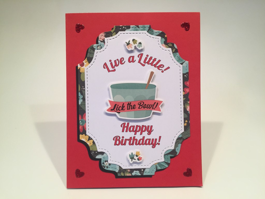 This makes me smile! I printed the Live a Little and Happy Birthday sentiments on another piece of the LFL white card stock from our kit using the Lobster 1.4 font and die-cut that with an old LDRS Fancy Rectangle and Layers die. I die cut the larger layer from pattern paper and a piece of black card stock. I glued those all together using the black piece to add a bit of a drop shadow, and glued them down to the last Red card base. I added the Lick the Bowl and the two small flower stickers with foam tape and finished off this card with some Red Glitter Heart peel offs (from last month’s add on peel off variety pack) to the four corners. If you can’t lick the bowl on your birthday, then something, somewhere, has gone terribly wrong!! I thought this shaped die worked quite well, and seemed very homey to me!