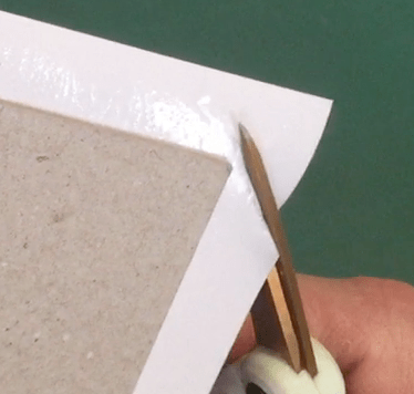I took some Aileens Tacky Glue and thinned it down with a little water to a thickness that was easy to spread with a brush. I used a damp stamp cleaner to wet down the front of the pattern paper (helps the glue soak into the paper) and brushed the glue all over the back of the pattern paper. I centered the chipboard piece on the pattern paper and pressed it down. Then I trimmed away the corners. When you trim your corners, you want to stay about an eighth of an inch away from the corner of the chipboard. That will help cover the corners of the chipboard without things getting bulky and wrinkly!