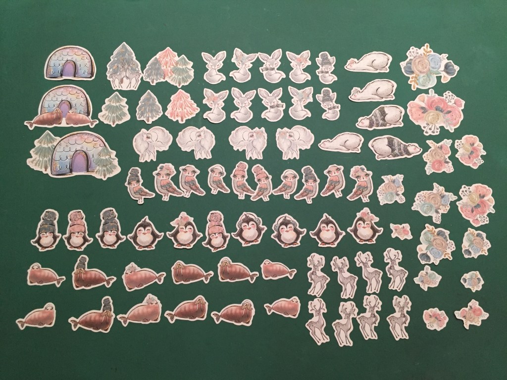 And here’s our pack of ephemera all laid out for your perusal. All of these die-cuts are images repeated from the pattern papers with different accessories and in different sizes. Lots of our animal friends as well as a number of florals and even a few igloos!