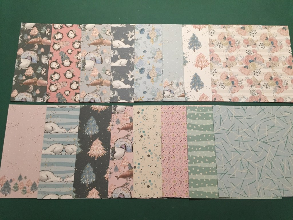 Tha Warm Winter Wishes pattern paper pack includes 16 sheets of 6″ x 6″ single-sided patter papers. Nice thick card stock featuring all sorts of winter animals from penguins to polar bears, arctic foxes to walruses, bunnies, owls, igloos and deer. All on this soft palette of blues, mints, pale pinks and navy backgrounds. There are also a couple of floral and tree patterns and some simple stripes, dots and other background patterns.