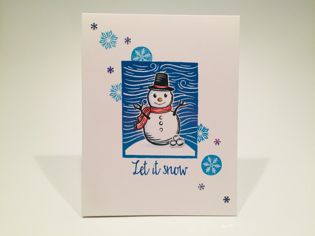 When I was happy with the stamping, I removed the snowman mask and there he was! Perfectly stamped in that background! I stamped the two snowflakes a few times using Splash ink and masking the background with sticky notes. I added some color to my snowman with my colored pencils, and stamped and die-cut the snowballs before gluing them to the base of my snowman. I first thought this stamp was berries to go along with the holly leaves, but realized they could just as easily be snowballs !