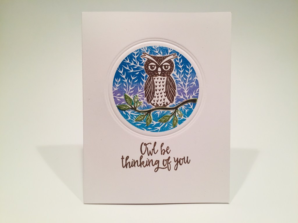 I stamped the owl first with Cup O’ Joe ink – masked that off and stamped the branch with Moss ink – masked that off and stamped the background – the Winter Sky ombre ink worked better here I think because this background is shorter than the rectangle one, so you’re not shimmying the stamp pad back and forth so much. I embossed a HA Circle infinity die around the stamping for a nice textural ‘frame’, and stamped the sentiment in Cup O’ Joe ink. I thought the branch was getting lost among the leaves of the background, so I die-cut and stamped another branch using Moss ink and colored the branch part with a Tombow Marker. I glued that over the stamped branch and I think you can see the branch a little better that way! I love the nice pun here… and not even a holiday card!