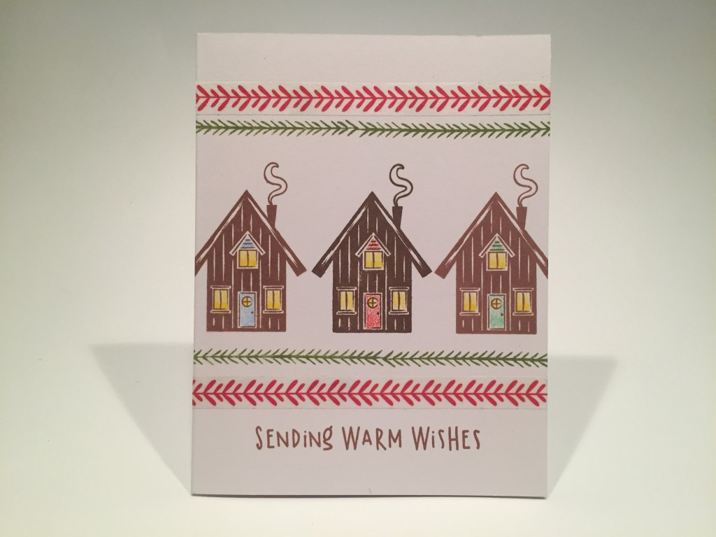 I stamped the houses in Cup O’ Joe and Sand Stone inks, and added spots of color with my colored pencils. I was struck by the similarity of the Red Vine washi tape and the short border stamp, so I stamped the garland twice above and below the houses with Moss ink and added a strip of washi tape next to both – notice both pairs go in two directions – top to the left, bottom to the right. I think that really compliments the houses so well! To finish up this cozy card, I stamped the sentiment with Sand Stone ink. Again, so simple… but it makes me smile and gives me the warm fuzzies..!