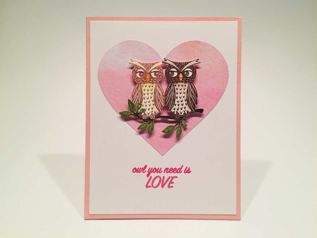 I stamped the die-cut branch on some Hero Hues Kiwi card stock using Moss ink and colored the branch with a Tombow marker. I created this pun-y sentiment and printed it on a panel of White card stock using the Sign Painter font. I cut that down to 4″ x 5.25″ and glued it to a pink card base. I die-cut a piece of “watercolor” pattern paper from my stash with a HA Nesting infinity heart die and glued that to the card front. I glued the owls to the branch and mounted them to the heart with foam tape. Who’d a thunk you could get a great valentine out of this kit!? Love this pun (you can sing it!) and love those owls!!