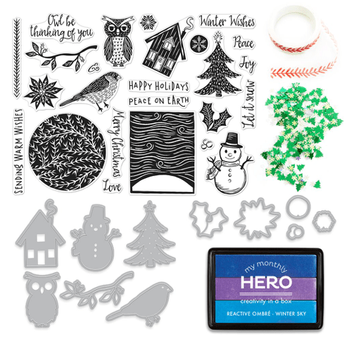 We also get a new Ombre stamp pad – “Winter Sky” (Blue Hawaii, Thistle, and Splash Reactive ink colors). A roll of Red Vine washi tape and a pack of Winter Forest sequins. This looks like fun! Obviously others think so too… this kit has sold out already!