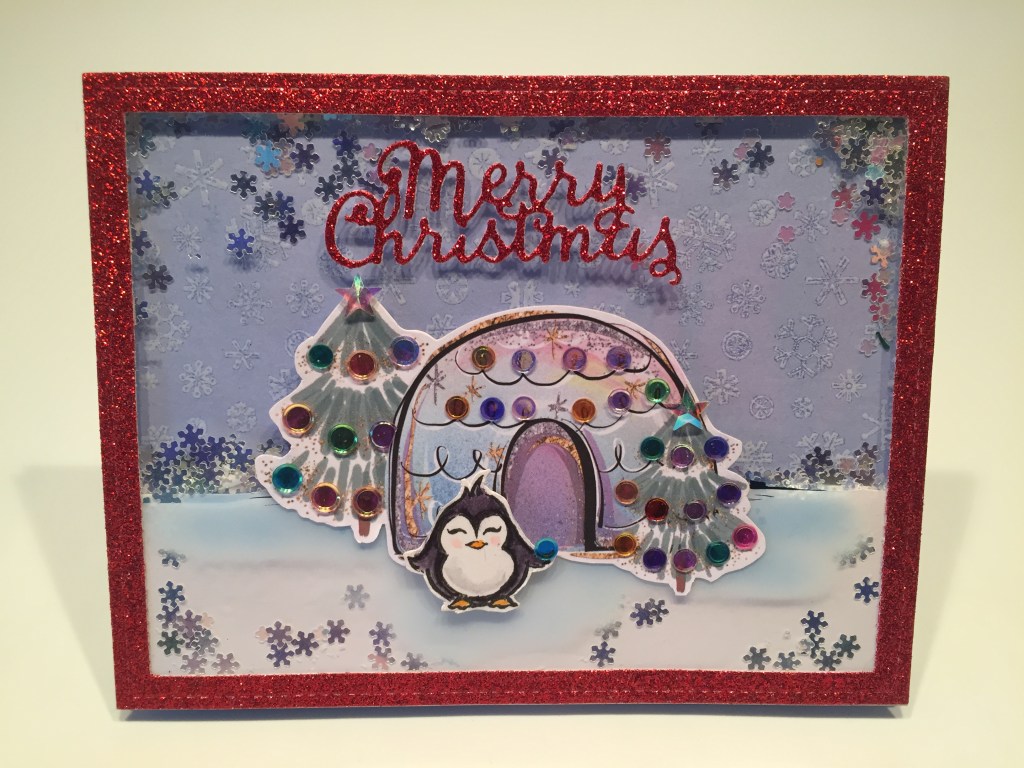 I did cut a piece of white card stock to go behind the printed part of this acetate sheet – it’s glued to the acetate along the edges but not across the top so sequins can get down there too! I die cut the frame and sentiment from some core-dinations glitter card stock, and glued those on top of the acetate. I added foam strips around the perimeter and along the printed snow, added a bunch of those snowflake sequins and glued that down to the card base. I glued the igloo ephemera on top of the acetate and “decorated” it with some old Simon Says Stamp Colorful Confetti sequins. I added one more ‘ornament’ to the little penguin’s hand and mounted him up on some foam tape. Cheerful and SHINY!!