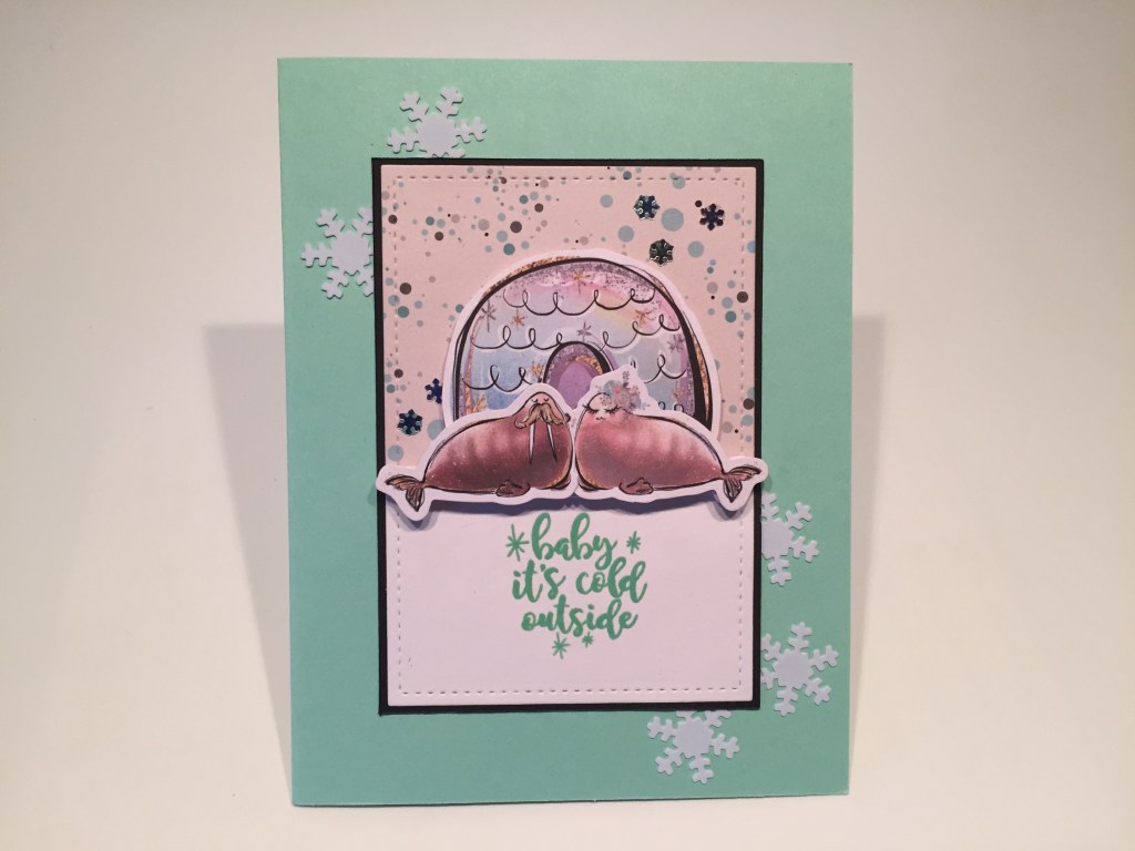 I did trim some of the white border away from our Wilford Brimley walrus along his chest – the individual walrus ephemera are a tad bigger than the igloo walrus so I had to squeeze them together a little bit! Some large white snowflake sequins from my stash nestle behind the card front on the Mint Green card base and a few small snowflake sequins around the igloo wraps this up nicely. Kind of the perfect illustration of this sentiment I think! LOL!