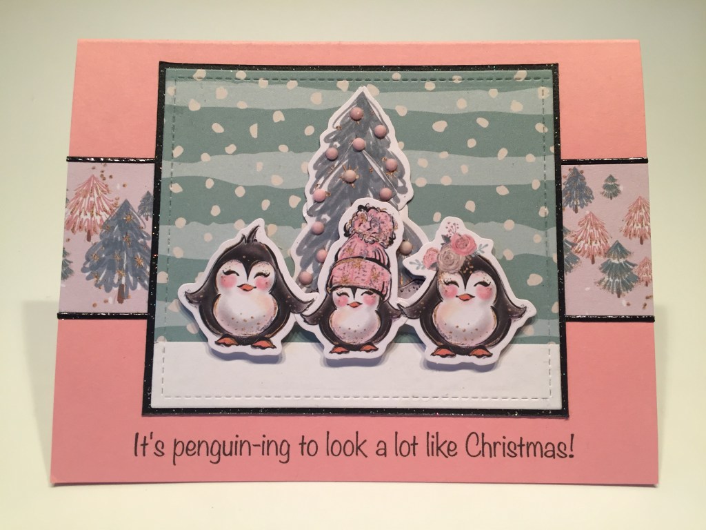 I printed this pun-y sentiment on the Soft Pink card stock using the Noteworthy font. I trimmed the pink tree border pattern paper down to a couple of 1.5″ strips and glued those in place on the card base, I outlined both of them with some LFL Black Glitter Peel offs and glued my background piece down in the center. To drive home the Christmas sentiment, I added some pink jewels from the Studio Katia Cupid’s Kiss crystal pack to the tree, and mounted the penguins with foam tape. Cute, quite pink, but cute! Fun Pun!