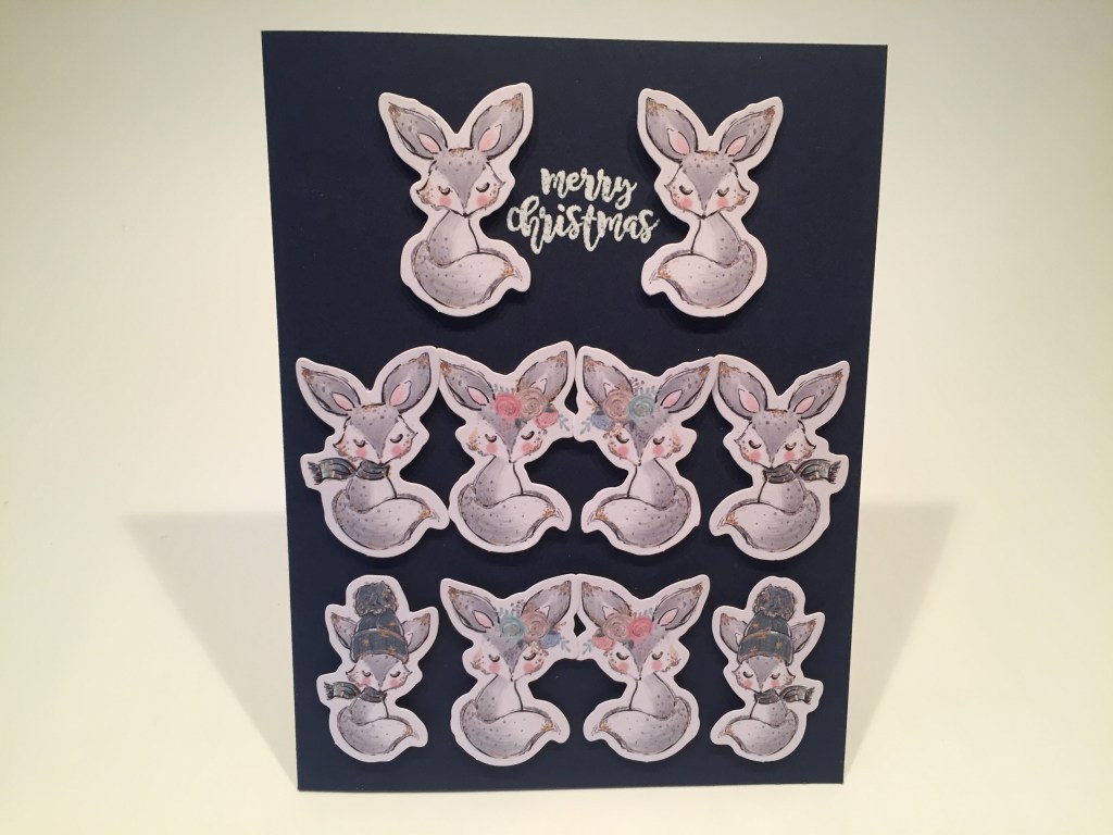 I sorted the bunnies into a vague hierarchy and attached them all with foam tape. I printed the sentiment on the inside writing surface using the Raustila font. Perfect Christmas card for anyone with a large family – or a bunny fetish!!