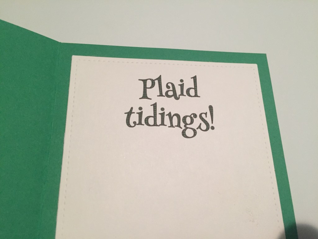 There’s a fun pun for a holiday card! This is printed on white card stock using the Henny Penny font, die cut and glued to the inside of the card. I wish you all Plaid Tidings!