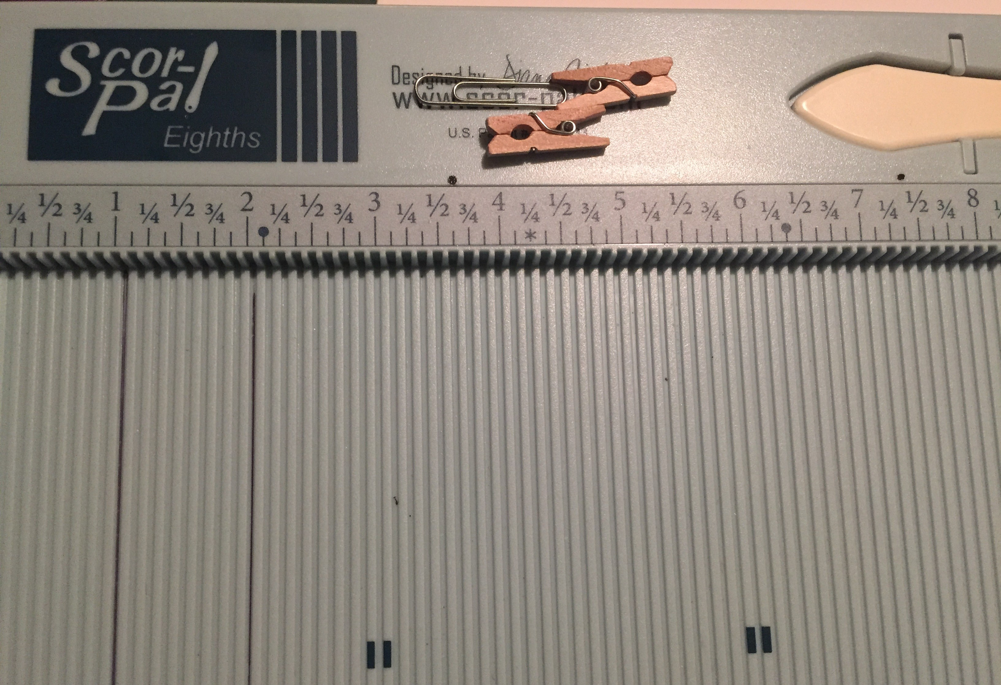 I have the Score-Pal Eighths which is the latest version, and features scoring grooves at every eighth of an inch. I love that! If you have a hard time navigating all those grooves, an extra fine point Sharpie will fit inside the grooves and you can make some reference lines at every inch to help you navigate the board – there are printed markings on the Score-Pal at 3″, 6″, and 9″ but a solid reference line at every inch can be very helpful!