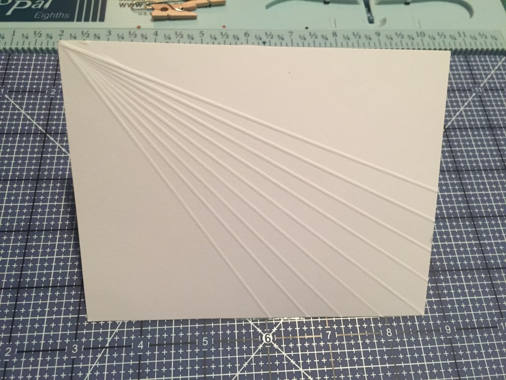This Sunbeam pattern is also a favorite of mine. Align your card stock on the diagonal at the 6″ mark and score right down the center from point to point. Then move the bottom corner 1/2″ right or left, keeping the top point at 6″, and score along the 6″ line again. Continue moving the bottom point 1/2″ right and left and scoring on the 6″ line as many times as you like – on this piece I did 4 scores to the right and left of the center score, but you can fill up the whole card panel if you like. This would look great embossed on color-core card stock and lightly sanded.