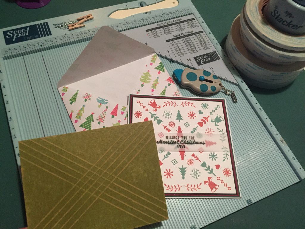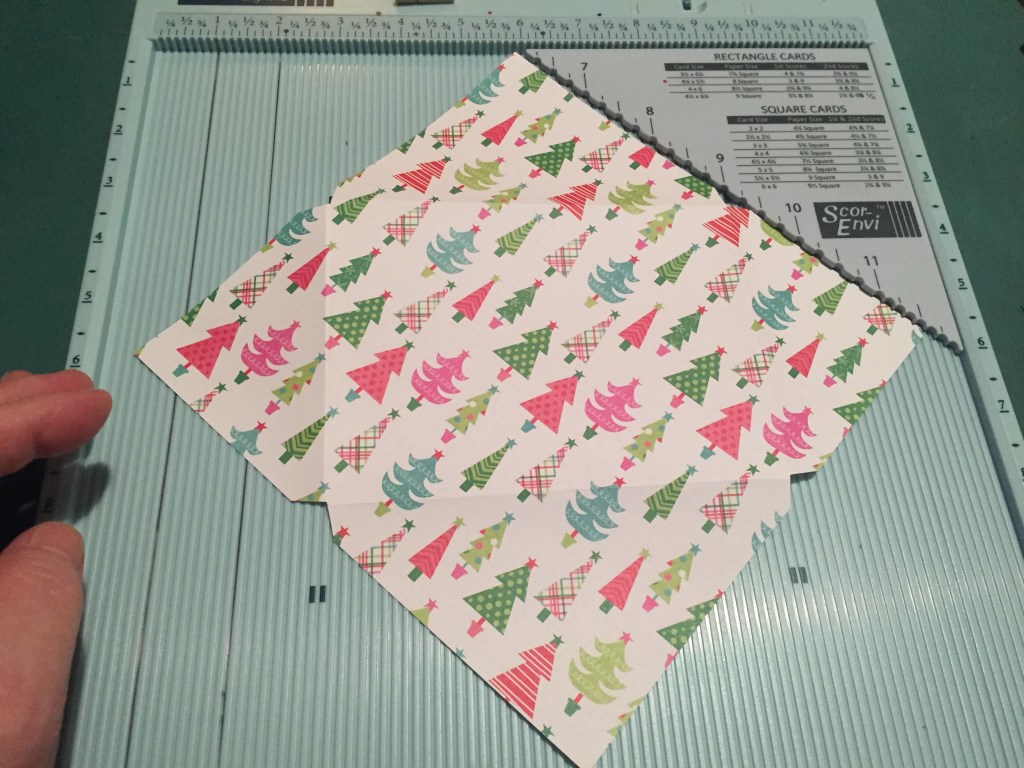 I have a 5 1/2″ x 5 1/2″ card sitting on my desk that needs an envelope – there are a variety of square envelope sizes printed on the Scor-Envi template too. I start with a 9″ x 9″ square of pattern paper, line it up with the template and score at 3″ and 9″, rotate 90 degrees, score again at 3″ and 9″. Trim off the triangles, and fold up your envelope.