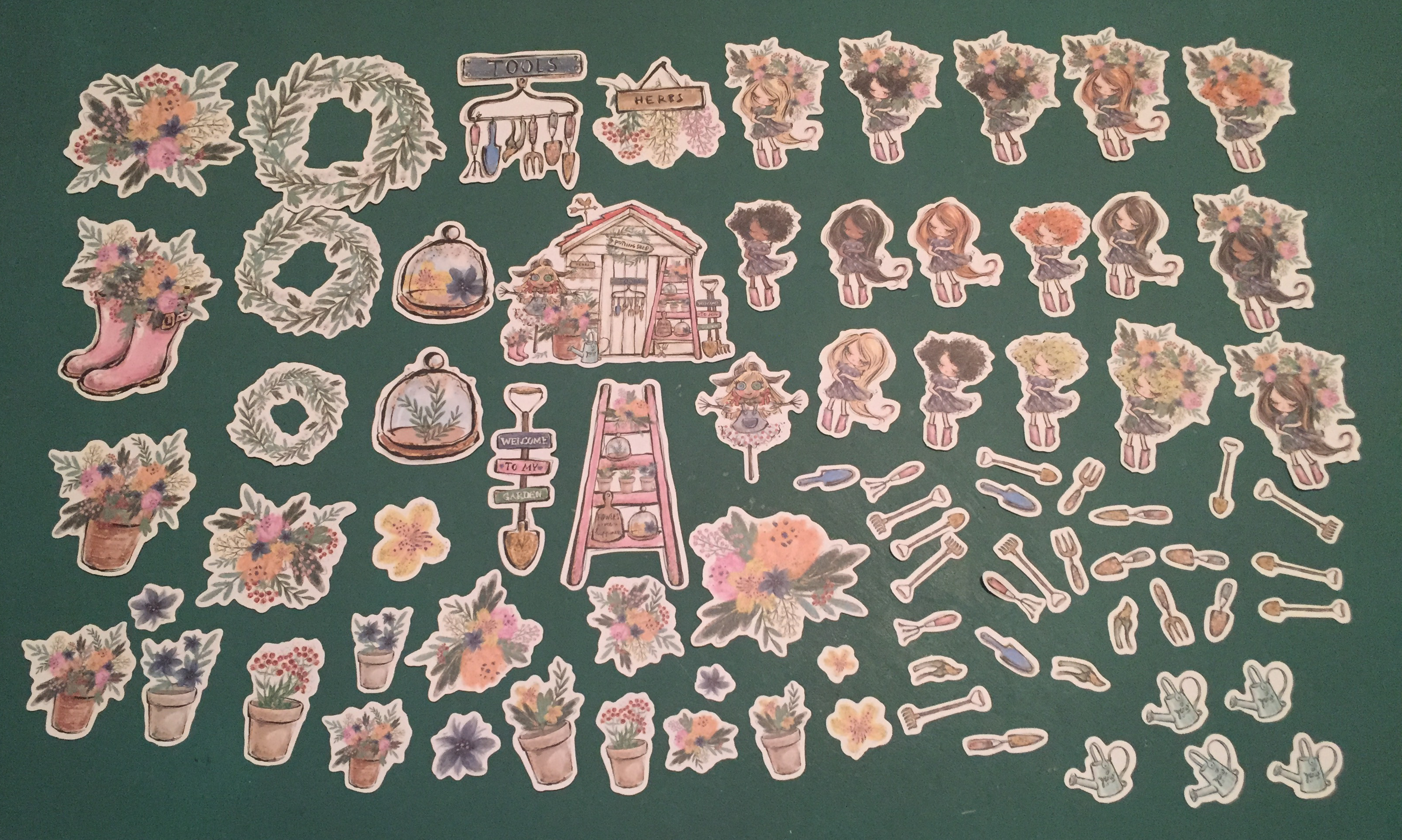 Naturally, Lizi is going to include a big pack of ephemera in this kit! These die-cut images include a fully decked-out potting shed, 16 different Eyelash Girls, lots of gardening tools, flowers, plants, wreaths, and even a pair of boots (wellingtons) sprouting flowers. Enough ephemera to keep you going for a long time!