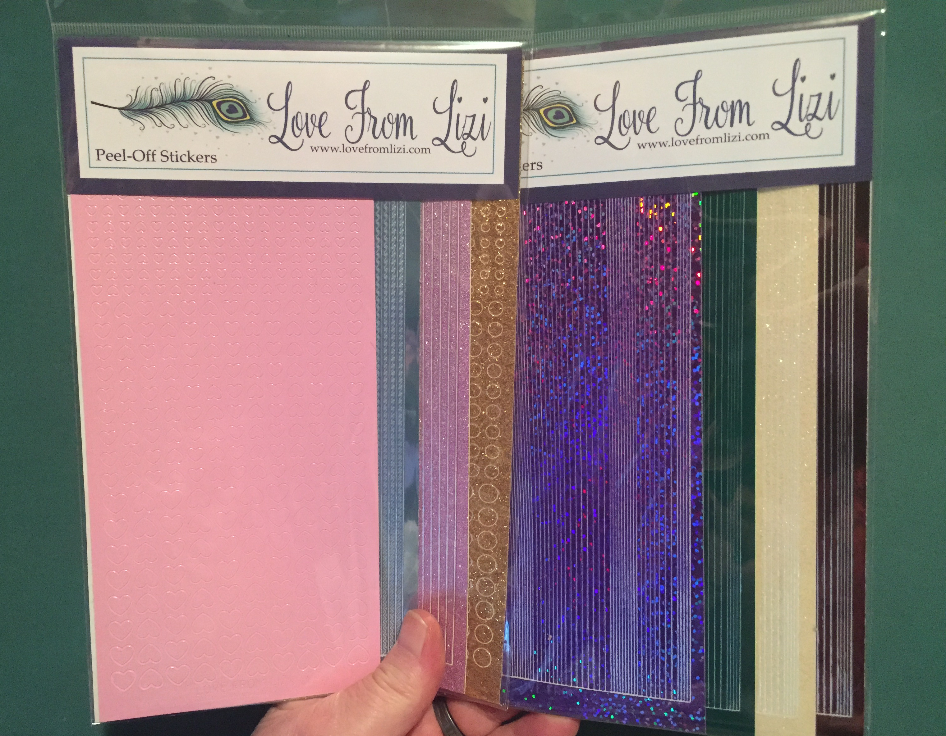I did get the two Add-on Peel off Bundles this month. On the left is the Really Dig You Variety Peel off Bundle that includes Pink Mini Hearts, Blue Sway, Mauve Moondust Straight, and Gold Glitter Mini Circles (New!). The Really Dig You Pin Stripe Peel off Bundle (on the right) has a sheet of the NEW Purple Holographic peel offs as well as Green, Lemon Glitter and Brown Mirror. All selected to compliment this kit (and add to our peel off stash!)