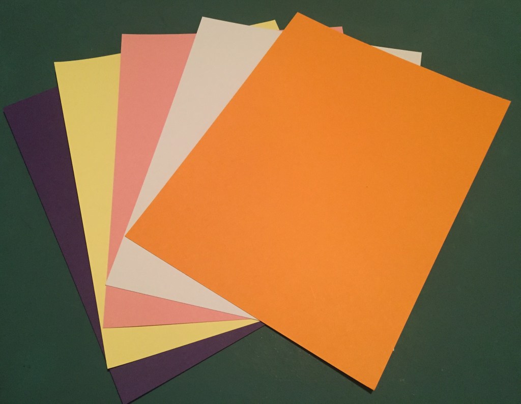 We start with our five sheets of 8.5″ x 11″ card stocks in a Royal Purple, Soft Lemon Yellow, Pink, super-smooth alcohol marker-friendly White, and an lovely Orange / Tangerine that is quite springy!!
