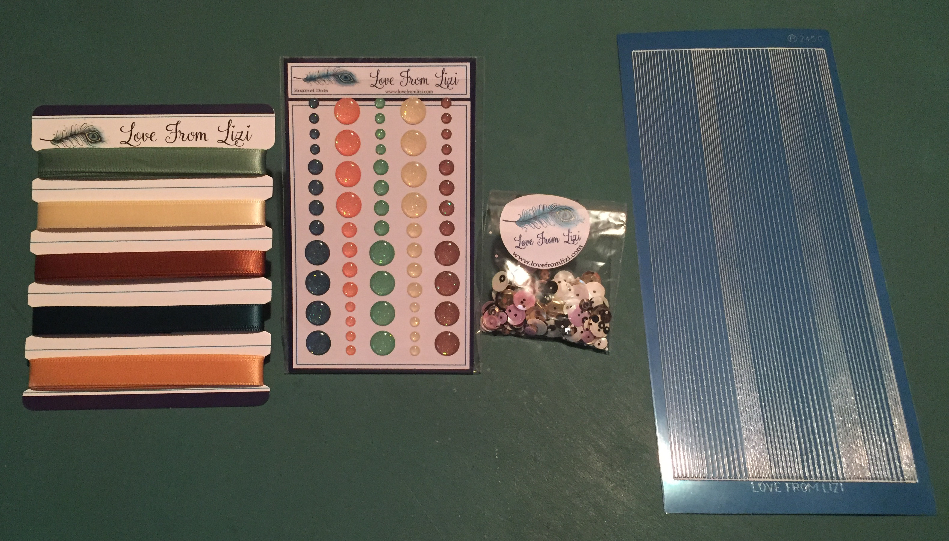 We do get our matching Satin ribbon and Enamel Glitter dots. One meter each of light green, pale yellow, brown, dark green, and a soft orange 1/4″ ribbon that matches our assorted enamel dots. The sample pack of the “Really Dig You” sequin mix includes pink, gold, oyster, navy and chocolate brown sequins in assorted sizes. And we get a new color Peel off this month! This is the Petrol Blue pin stripe peel off that has a smooth mirror Finnish. Great color!