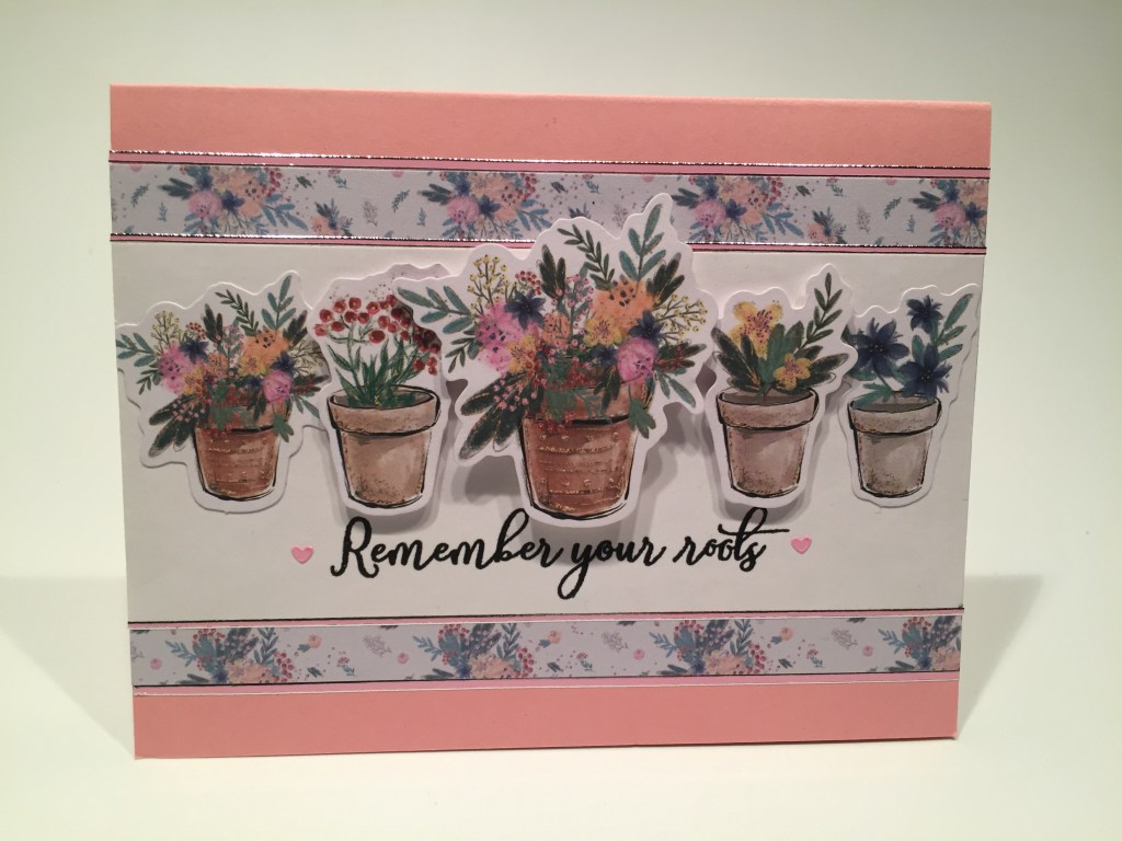 Here’s the perfect opportunity to use a bunch of our potted plant ephemera and this affectionate sentiment! I cut a scrap of White card stock to 2 3/8″ x 5 1/2″, stamped and embossed the sentiment in the center towards the bottom. I added a piece of pattern paper behind that cut to 2 7/8″ x 5 1/2″ and glued both to the Pink card base. I outlined all of the edges with the Pink/silver Pin Stripe peel offs we got in last months kit. I glued the pots on the sides flat to the card front, added the next two pots with foam tape and mounted the largest pot with two layers of foam tape. A couple of Pink Mini Heart peel offs from the Really Dig You Variety peel off pack highlight the sentiment and match the pin stripe peel offs perfectly! I like the dimension on this card and can imagine a variety of uses for a sentiment like this!