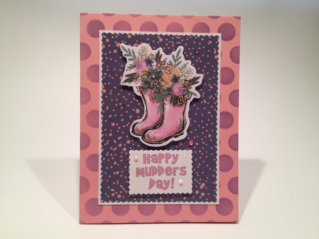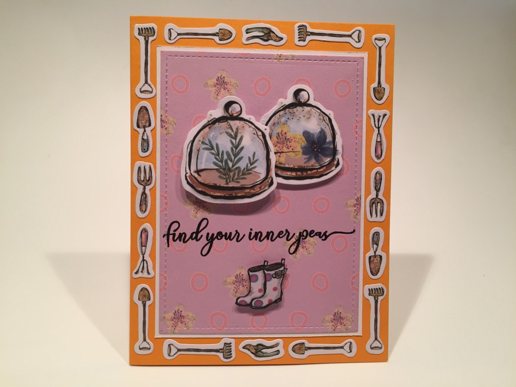 I couldn’t find any peas in our kit, so I figured these glass domes would work to give us some sense of “inner”..!? LOL! I die-cut this pattern paper with a LFSR die, and stamped and embossed the sentiment in the lower third. I added a thin white mat behind that and glued those to our Orange card base. I stamped the boots on the polka-dot pattern paper, added a little shading with colored pencils, fussy cut them out and glued them together. I glued the garden tool ephemera pieces all around the edge, and then mounted the two domes and the boots with foam tape – two layers on the left dome. This is a really bright card! The orange circles on the pattern paper match the card base nicely, though I would generally never pair pink and orange together – but it works very nicely here! Another note… I believe the greenery under the left dome would pass as thyme…!
