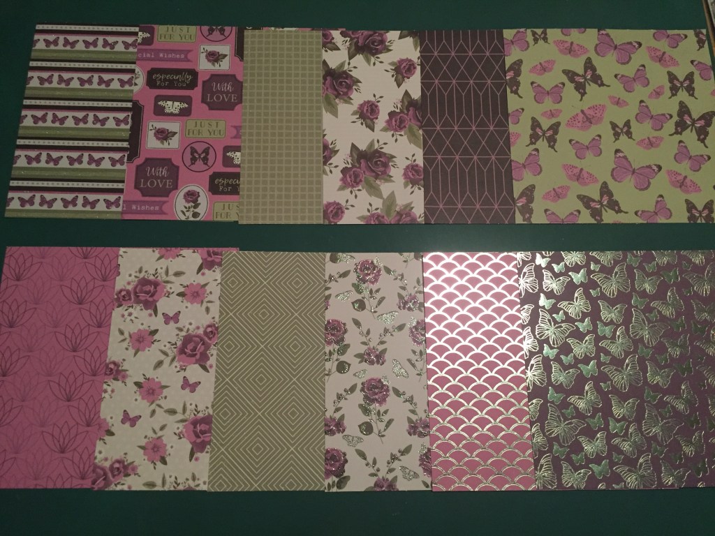 We get 12 sheets of 6″ x 6″ pattern paper this month, with some glitter and foil accents on some of them, and all featuring that great Lilac / Aubergine / Moss palette. LOVE those dark purple roses!! Not sure which I like better… the Aubergine or the Moss..!?
