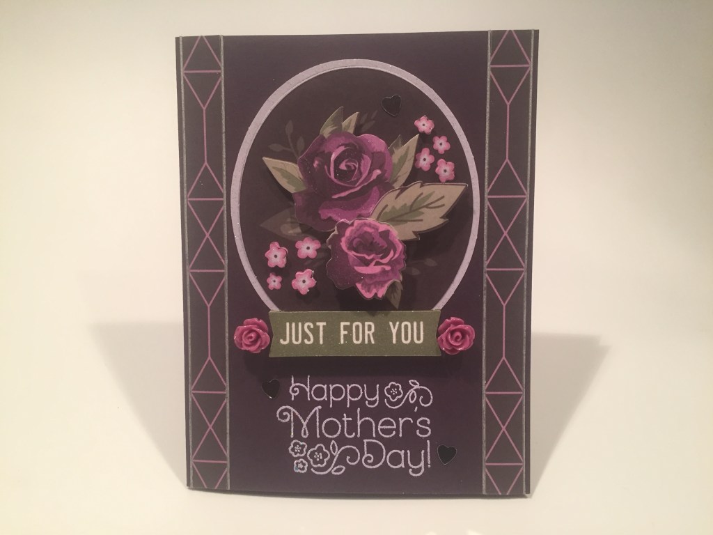 I also don’t really love a “Just For You” sentiment, so after looking at cover-up options, I let the decoupage banner stay and just added a nice “Happy Mother’s Day” stamp. I think that’s the only Mother’s Day stamp I own… from an old (April 2016) My Paper Pumpkin kit. The flowers on the stamp match the small flowers on the decoupage! I fiddled around with some different purple inks to stamp this sentiment, and ultimately decided to stamp this with VersaMark ink and emboss it with Love From Lizi Pastel Purple Party embossing powder. More glitter!! I glued the decoupage piece to the card front and added some silver hearts from the sequin mix, and two of the resin roses beside the banner. Mother’s Day is still a week away and now I have a few options for cards to send out to mom!