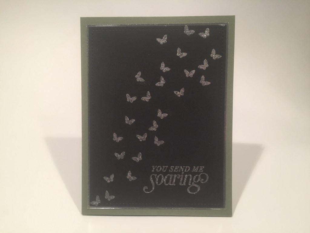 But that doesn’t mean I have to USE the background stamp as a background! Using my MISTI again, I stamped the background stamp twice on a panel of Black card stock. I masked off the butterflies I didn’t want, inked the stamp with VersaMark ink, removed the masking, and stamped the selectively inked butterflies on the panel. I embossed all the butterflies with Love From Lizi Silver Glitz embossing powder. This sentiment is from an old Stampin’ Up “Sky is the Limit” stamp set, embossed with the same Silver Glitz powder – great sparkle! I die cut the panel with a LFSRdie, added a thin mat of brushed silver behind that, and glued them both the the Moss Green card base. I tried the Silver Mirror specialty card stock in our kit but the mirror effect was a little too much competition for these little butterflies! I really like how this card turned out! It’s almost the direct opposite of the Monarch card, but both of them are really effective!