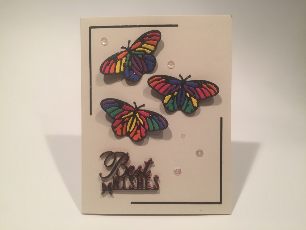 Okay, so I am a totally anal-rententive overly-detailed crazy craftsman, but I really like these rainbow butterflies! I rounded up some rainbow scraps of card stock and my trusty Black Tie glitter card stock and started die-cutting. Three black butterfly outlines and one butterfly each in Purple, Blue, Green, Yellow, Orange and Red. I was very careful not to lose any of the die-cut pieces from the rainbow cut outs. I put a piece of blue painters tape on the back of the Black Tie outlines, and trimmed the edges to match. Then I simply pieced in all the colors – burnishing everything down when complete. SWEET!! I grabbed the “Best Wishes” die from the embellishment bag and cut it 7 times using all the rainbow colors and one Black Tie glitter die cut for the top. I glued those all together for a nice chunky sentiment that matches the butterflies perfectly!