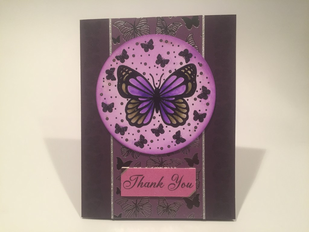 Though this card is fairly similar to my Monarch card, they are both quite different in appearance. I really enjoy coloring in almost any medium – I think it’s very therapeutic – and figure that if I’m going to take the time to color a stamp, then I think that stamp should probably be the main focal point on a card. And these are both pretty big butterflies!