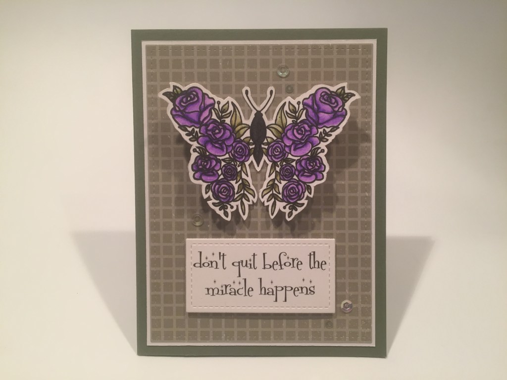 I stamped that groovy butterfly on more LFL White card stock using VersaFine Onyx Black ink and colored it with my Zig Clean Color markers, and then fussy cut him out. I die-cut the grid pattern paper with a LFSRdie, added a thin white mat behind that, and glued them down to the Moss Green card base. I glued the butterfly body flat to the card front and added foam tape behind the wings. I printed this sentiment on a scrap of White card stock using my Silhouette software and the Fontdinerdotcom Sparkly font. I die-cut the printed sentiment with another LFSRdie and foam taped it to the card front. I added a little sparkle to the butterfly body with my Spectrum Noir Sparkle pen, and a few iridescent sequins for a little extra pop. VERY interesting butterfly stamp – don’t think I’ve seen anything like this before! I love this sentiment too – very encouraging!