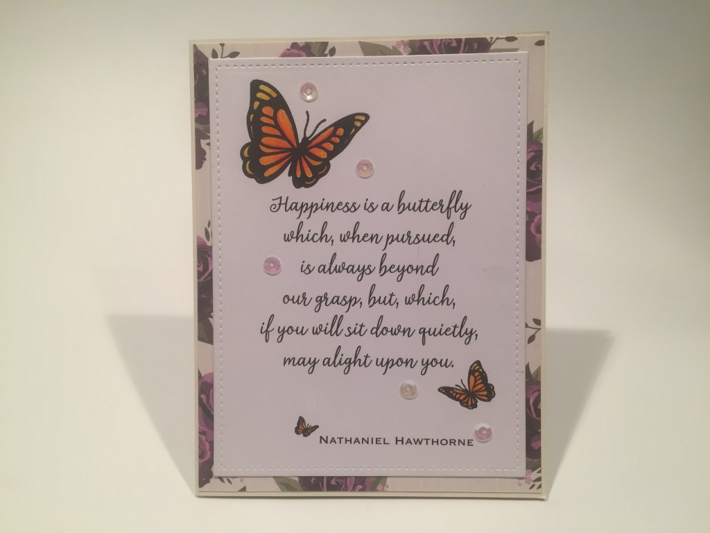 I started this card with the quote laid out in my Silhouette Software, and printed it on another panel of LFL White card stock using the Dream State font for the quote, and the Copperplate font for the name. I laid out the butterfly stamps to help me decide where to die-cut this panel with a LFSRdie. I stamped the butterflies with Onyx Black ink and colored them with my Stabilo Markers – pretty easy stamps to color! I cut the rose pattern paper to 4 1.8″ x 5 3/8″ and glued that to the Ivory card base. I glued the card front to the center and added more sequins for some sparkle and sense of movement. Since these stamps are the same image in different orientations and sizes, it kind of feels like the butterfly is getting closer to us! I don’t usually include such large verses on my cards but this quote felt special to me!