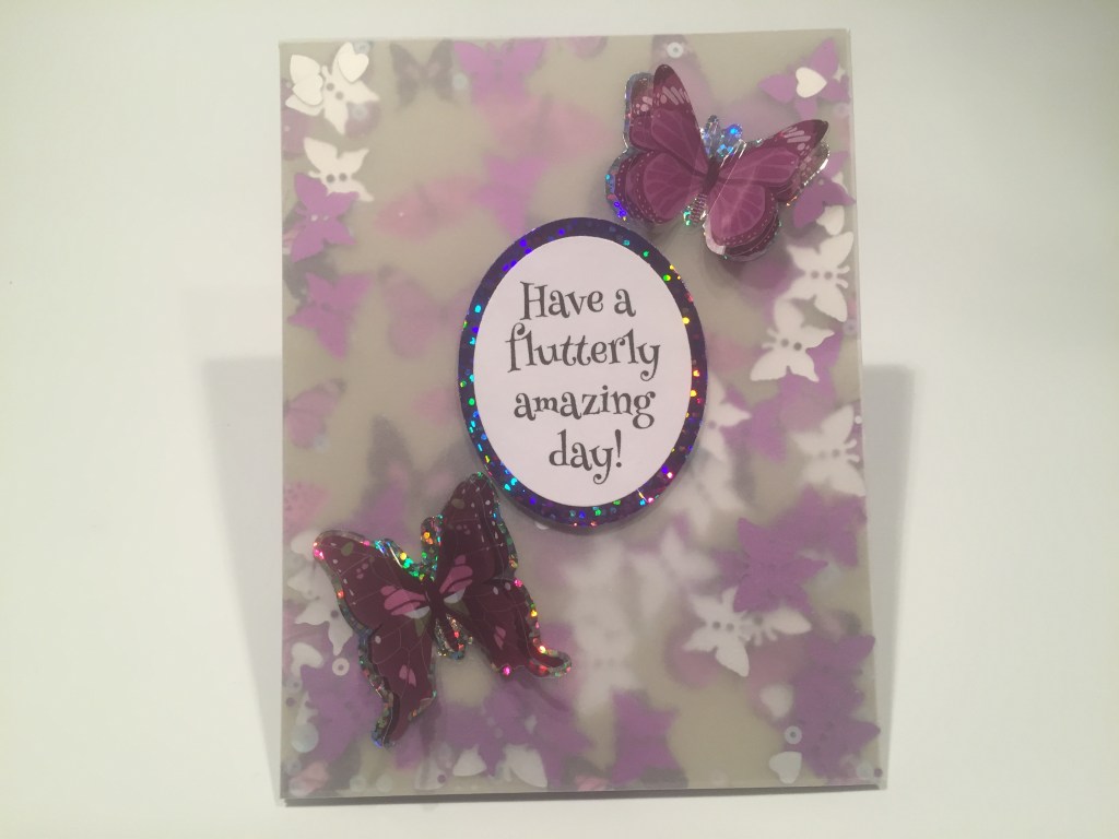 I printed this pun-y sentiment using the Henny Penny font, and die-cut it with a HA Infinity oval die. I added a purple holographic mat behind the sentiment cut with another oval die, and foam taped them to the card front. Two of the butterfly stickers complete the picture.