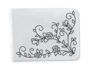 When I was digging through my embossing folders for the Monarch card, I came across this small Sizzix embossing folder that came with my Sizzix Sidekick die cutting machine. There are actually some small roses among that filigree! That should work quite well! I cut a panel of dark Purple card stock from my stash to 2.75″ x 5.5″ and embossed opposite corners with that small folder. I then took my finger dauber reserved for White pigment ink, and, with out adding any more ink to it, lightly brushed that over the embossing to add a little more definition.