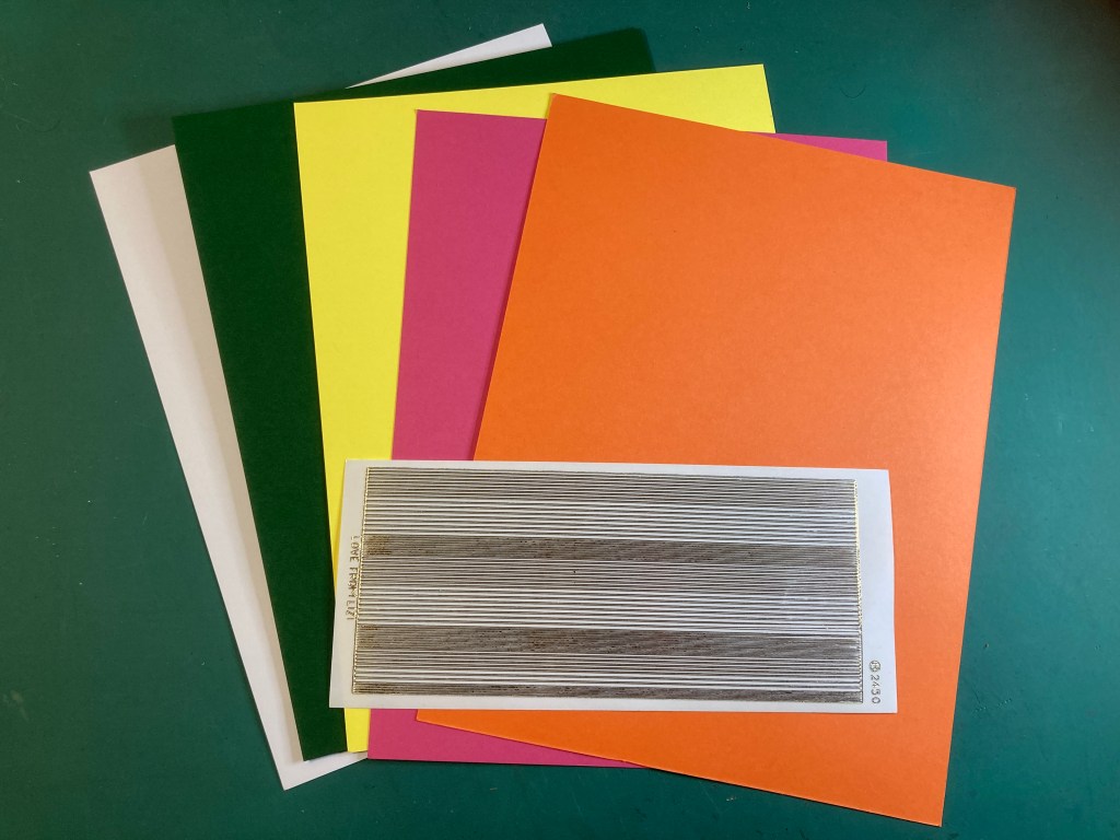 Our five sheets of 8.5″ x 11″ card stock sets the tone with a Zesty Orange, Cerise Pink, Bright Yellow, Dark Forrest Green and a sheet of LFL super-smooth alcohol-friendly White. Our Pin Stripe peel off sheet is a new Clear Gold Mirror style that is basically clear peel offs outlined with gold – you kind of get 2 pin stripes for each peel off!