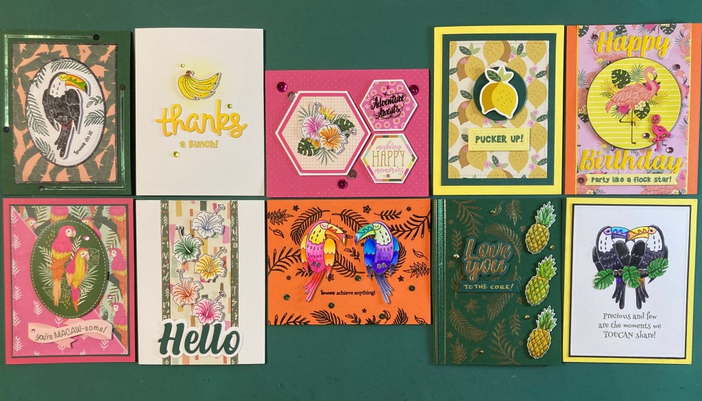 That completes my 10 cards using the Love From Lizi June 2021 Tropical Escape Card Kit. Bright and colorful across the board. Taken all together, these cards don’t feel too awfully pink, but they are certainly bright and cheerful!