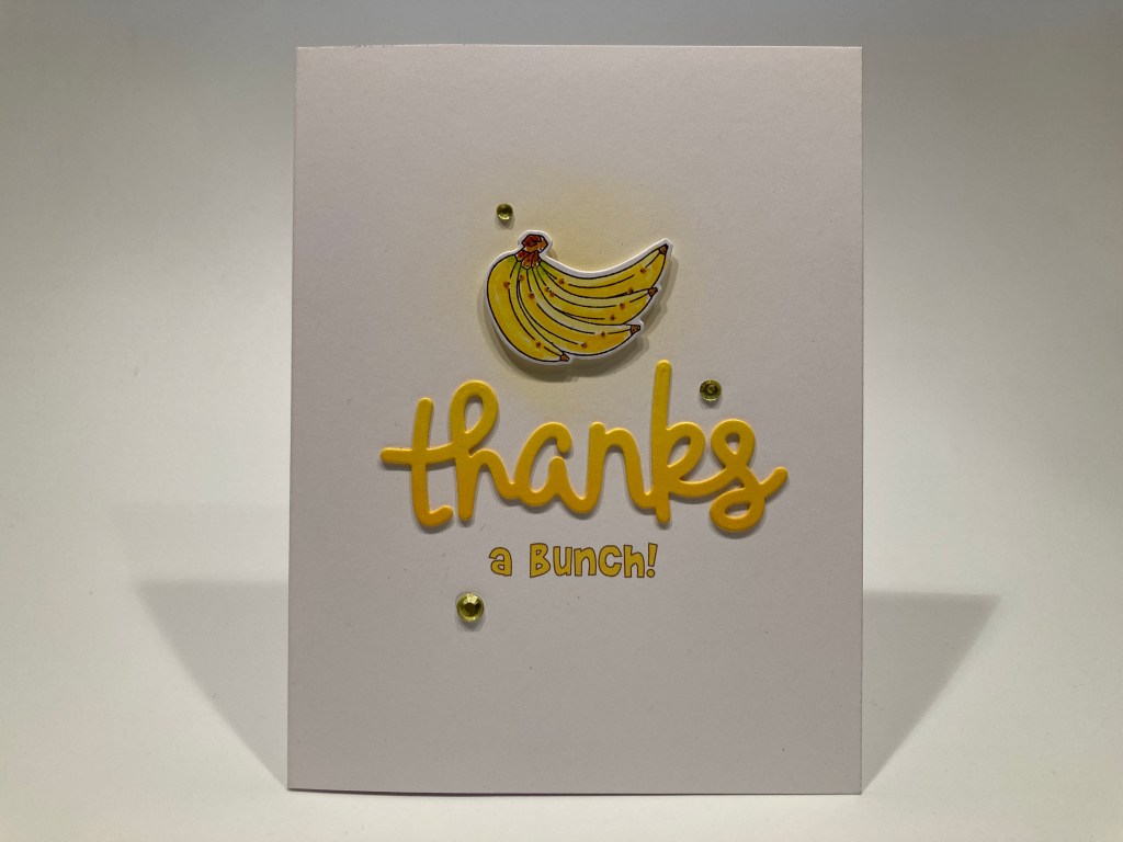 I softly blended some Squeezed Lemonade Distress Oxide ink behind where the bananas were going to go, glued the sentiment in place and used foam tape to attach the bananas. A few of the yellow crystals adds a bit of sparkle. You know how much I love my white space, and I really love the ombre on the die cut.