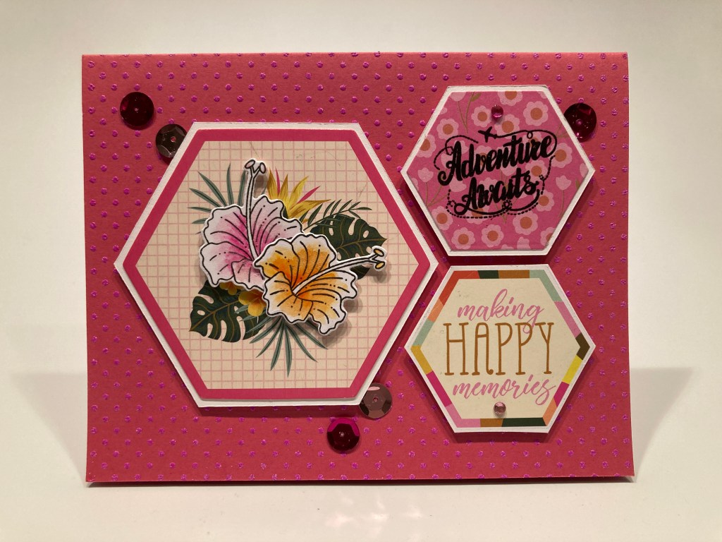 I stamped another hibiscus bloom, colored it with my Zig markers and die-cut it to go along with my original bloom. I added both blooms over the printed hibiscus on the card topper – pink for pink and orange for orange. That added a nice touch of dimension to the topper, and brightened up the arrangement. I stamped “Adventure Awaits” (from the LFL April ’19 Bon Voyage stamp set) on the pink hexagon with Onyx Black ink and embossed it with some clear embossing powder. I mounted the three hexagons to the card front with foam tape and added pink sequins for more shine. This is definitely a PINK card! It’s hard to avoid that when you have such a bright pink card base..!